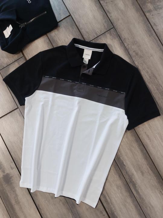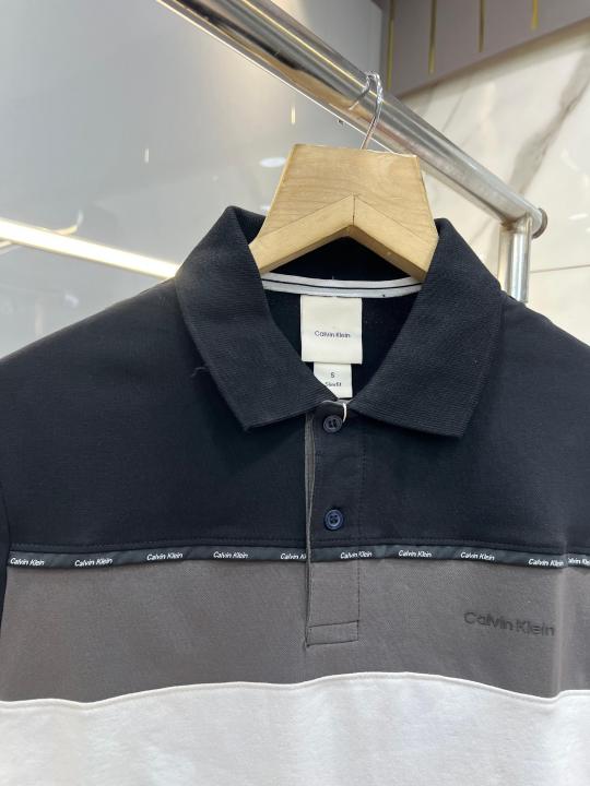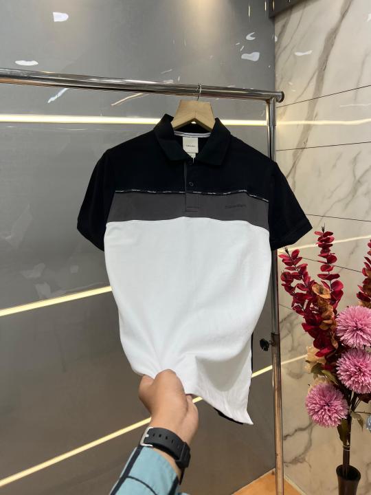 Calvin Klei n Black Premium Imported 240 GSM Interlock Lycra Fabric Polo Tshirt with Shoulder Design and Emboss Logo 4070