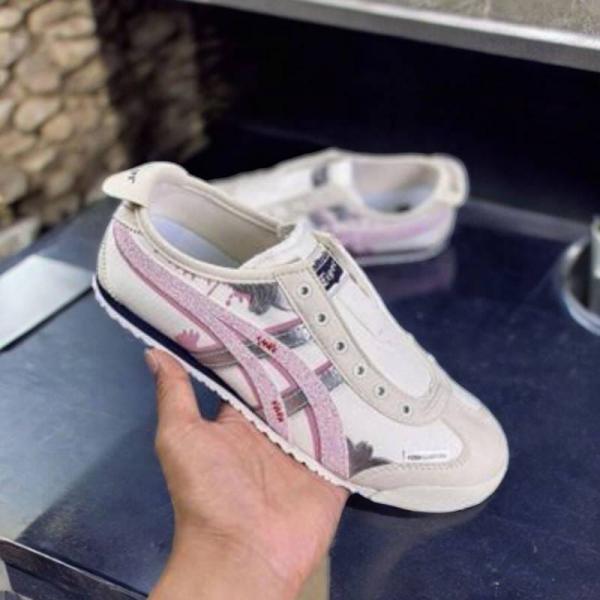 Soft Pink & White Palette: The upper is bathed in a delicate pastel pink with crisp white Tiger stripes, creating a fresh, aesthetic look perfect for spring and summer.