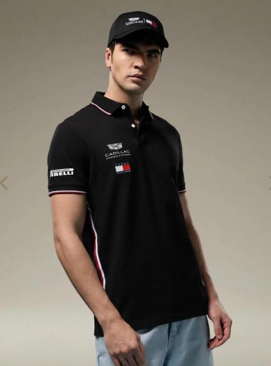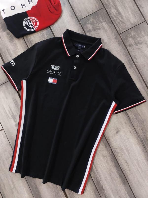 Home T-Shirts Tommy Hilfige r Black Premium Imported 240 GSM Interlock Lycra Fabric Polo Tshirt with Front Design and Emboss Logo 4084