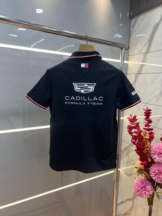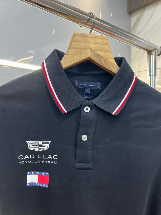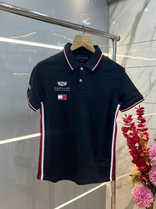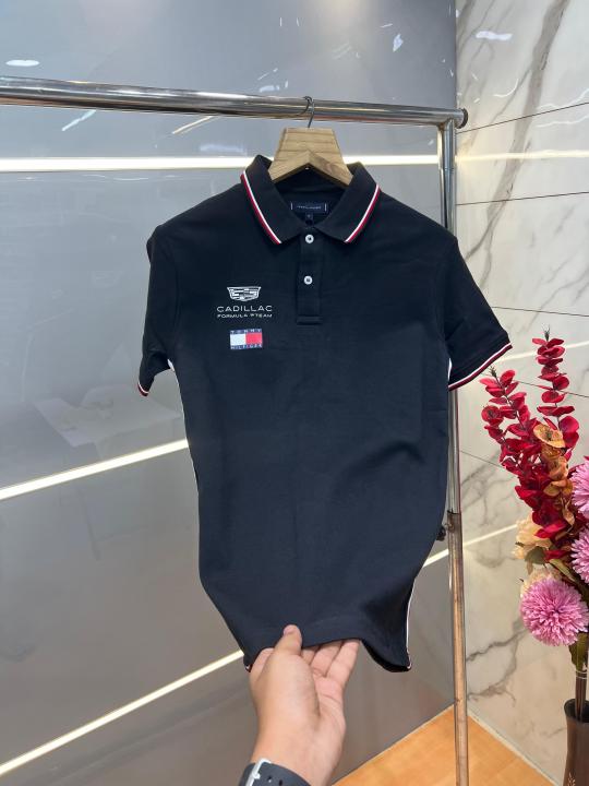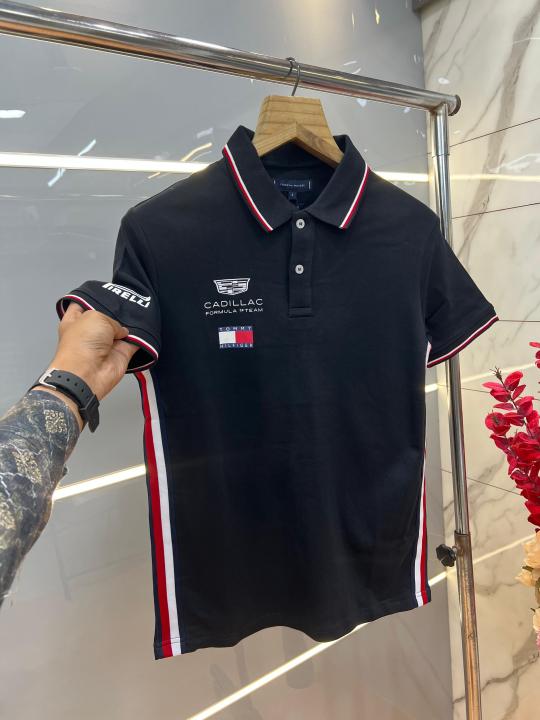 Tommy Hilfige r Black Premium Imported 240 GSM Interlock Lycra Fabric Polo Tshirt with Front Design and Emboss Logo 4084